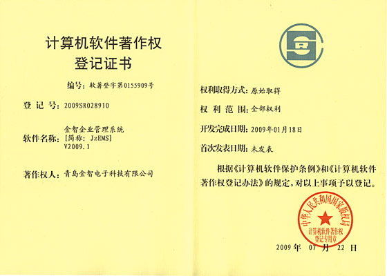 2009年7月22日,由青岛金智电子科技有限公司自主研发的金智企业综合管理系统,顺利通过国家版权局认定,软件即将火热上市,目前金智企业综合管理系统可以免费下载试用30天,无任何功能限制,推广期购买的用户也将获得超低的价格和永久免费升级的服务。